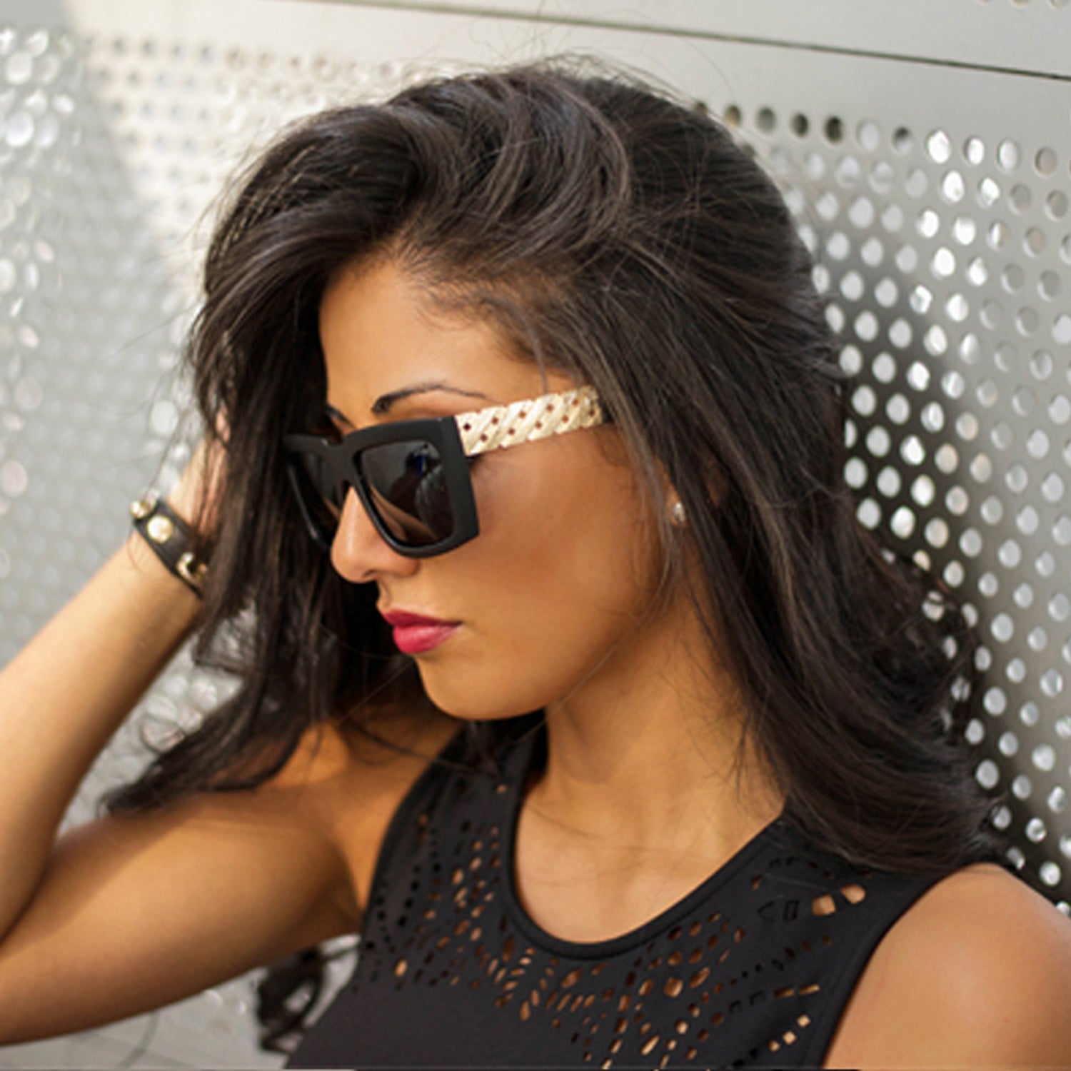 A tribute to Gianni Versace's legendary Miami Beach residence, the Jase New York Casero sunglasses translate architectural grandeur into wearable design. Intricate metal lattice detailing on the temples echoes the ornamental ironwork of Casa Casuarina's storied entrance, creating a statement piece that honors fashion history. These frames seamlessly blend timeless elegance with modern sensibility, delivering understated luxury for the discerning wearer. 56MM/22MM/140MM (LENS)/(BRIDGE)/(TEMPLES).